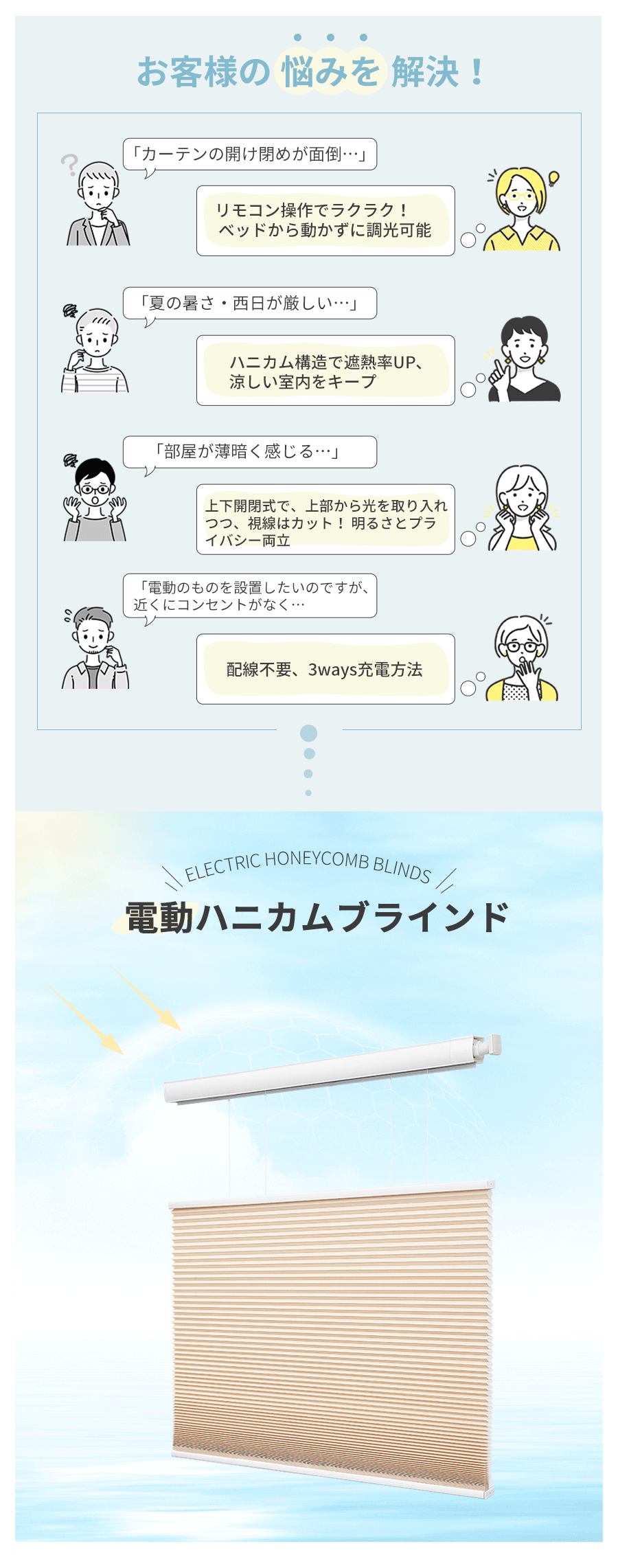 KeeGo「電動ツイン ハニカムシェード(コードレス・充電式)」…コードレスでUSB充電対応の突っ張り式電動ハニカムシェード。賃貸でも設置可能な工事不要タイプで、遮光・断熱・採光に優れた多機能モデルです。レビュー評価も高く、手軽さと実用性を兼ね備えています。